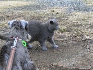 =お名前判明=いつもの駐車場で会うニャンちゃん。今日名前がわかりました。といっても、元は迷い猫らしく、今の飼い主?さんがつけたものらしいです。グレーだから、ぐれチャン。あとは片目がないので、正宗と呼ぶ人もいるらしいです。・・・・・・・・・・・・・?(°_。)?(。_°)?ということは、現在もおうちの中にはいない?一応犬小屋みたいなのをお庭において、寝たければ寝ていいよというかたちにしてるようす。もとより、鈴のついた、青い首輪をしてるし、R2がちかずこうが、R1がなでようが、全然怖がらないし、甘えてくるようす。(*^_^*)猫にはなじみのない我が家。どきどきしつつ、なでさせてもらってきた。猫なれしてない私たちが平気なのだから、間違いなく、どこかの飼い猫。チョコがそばへ行かない限り、本当に愛想のいい子だった。すごいわ、相当かわいがられて育ったのね。というかんじ。毛並みもいい感じ、ふくよかさはいうまでもない・。。。たまたま写真撮っていたら、その子を一応?みているおば様が話しかけてきてくれたのだ。チョコが興奮してダイブしても平気だったし、(もちろん汚れるのでとリードはきつく持っていたけど、いいのよいいのよっていってくれたので)動物全般がすきなのかな~。そしてぐれチャンが迷ってきたコロからのお話をしてくれたのだ。ちょっと不思議な感じではあったが・・・・それは猫と犬の違いかも?と思いつつ、雨が降ってきたので失礼させてもらってきた。(^^ゞ猫って基本は自由に外へ出て遊んでいくものなのかな~。いまいち、いまだにわかりません。これは賛否両論なのかな?(・_・)......ン?1枚目がぐれちゃんは人がスキっていう感じでR2のところへいきたそうにしてる、チョコはまっしぐらにぐれチャンへ。という写真。2枚目は雨降ってきたから、帰ろうかなってぐれチャンのそばにどきどき「さわれるかな?」というためらいR2.うふふ。(#^.^#)短い散歩の中にも楽しいことはあるものだ。チャンチャン。前日分更新たは。とりあえず、動画第一弾できました♪ただ・・・・首を曲げないといけません。携帯で撮るのに慣れていなくて、間違えたようす。次回は間違えずやります。とりなおせ!って?あははは・・・・``r(^^;)コレでもがんばったので、お許しください。終了~。