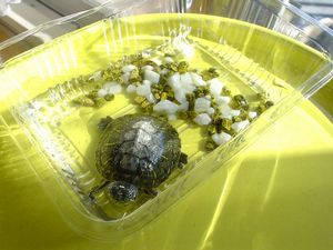 おはようございます。(#^.^#)本日の亀の様子です。雪が降りましたので、ベランダの、池もどきからは、移動です。ぶっちゃけ、「えりんぎ」の空き容器です。あはっは!!!!ヽ(´▽`)/どうにもなりませんでした。夏の虫や、魚やかえるをちょこっといれる容器がわれてしまい・・・・・・・・・・・・・・・・・臨時です。が!当の亀さんは。いい感じのようす。え?嫌がってるかも?わかりませんが、外にいると、浮石の下にもぐって、一日中日陰を楽しみ、引きこもっている亀さん。この容器だと、狭くて、大きな石が入れられないのもあるけど、明るいし、えさも見つけやすい、日向にも移動しやすい。私にも、亀にもいい気がする。。。。突然の暖房生活。。。とまどってるかな~。でも、何せ小さいので、冬眠は心配だし。( ̄□ ̄;)!!早く大きくナーれ♪終了。