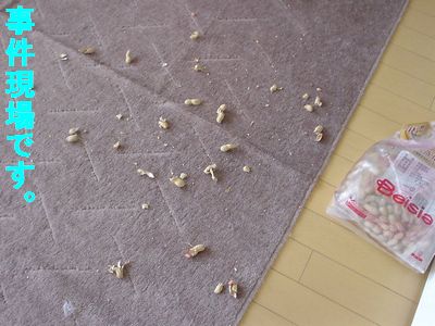 おはようございます。本日9時ごろ、千葉県某マンションにて事件が発生いたしました。被害は、8時に掃除機かけたのに・・・・ということと、犯人が口にしたものが犯人の体にどう影響するか!ということで、比較的小さなものですが。。。。まずは現場より。ぎょえー。。。。。(°◇°)~ガーンそして犯人。明らかな証拠までつけて・・・・・・・・・・・・・・_・)ぷっ笑えるあたりが困ったモンです。昨日だんなの実家に私ひとりで行ったときにいただいたもの。息子が食べたいといっていたものの・・・・売り場で見るとでかい、量が多いってことで回避していた、落花生。じいじばあばが好きで、食べかけが、いったらあったので、ほんの少しもらおおうと「これ、もらってもいいですかー?」とゴムで縛ってある、残り25%くらいのやつを指差し聞いたら、新品のでかいのをくれちゃった・・・・(;゜〇゜)(・_・ゞ-☆あー・・・・・微妙。が、いただいて帰ってくると、コレマタ家族ですねぇー。旦那も大好きで、早速空けて一人でぽりぽりしてました。そのご、開けっ放しで、キッチンにおいてあったので、外側ビニールをかた結びにして一段高いところにおいておいたのに。。。。息子を見送り、今日は珍しく、立ち話をしていて帰ってみたら!!!!こんなことに。(日ごろ寒いんだもん。。。。)ムカ・・・(-_-メ)>ビニールこじ開け、カラはいらないから中だけ食べてるし!!!!いっちょ前に!!!危なくなくていいけど、ビニールの小さい切れ端まで落ちてます。どこまでも餓鬼です。(°◇°)~ガーン(たとえ小さくっても食べ物でない、いらないものは口からぺっ!ってするチョコ)旦那が食べてるときから、かなり身を乗り出して、もらえないかと狙ってましたからにおいがするんですねー。(;_;)シクシクしかーし!!!彼はこの家の誰よりもアレルギーもち。人でもピーナッツ、ナッツ類はアレルギーが出る方も結構いたり、出たら怖いタイプの分類物なのに!!!!急いで、アレルギー検査の結果用紙を引っ張り出し、確認。・・・・・・・・・・・・・・・・・・・・・・・・・・・・・・・・・・・ナッツの項目ないよ。。。(゜ロ゜)ギョェいいのか?明らかにだめだから、イカとかチョコのようにのってないのか?(;_;)シクシク今のところ問題ないし、そう沢山の量でもないようだから、様子をみます。σ(^◇^;)今年も一年・・・・・食べ物だけを狙って暮らすのかしら・・・・・体型だけでなく、その精神も、野犬みたいだよぉー・・・・・ちょこぉー・・・・(~ヘ~)ウーン以上、事件現場からお送りしました。おしまい。(^o^)/~~~*現在入ってきた情報では、今のところ、何事もなかったように、当犬は、ベットでねているようです。。。。