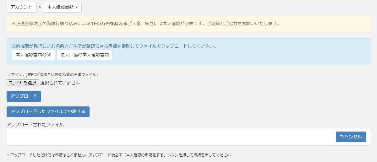 2. 以下の画面で「ファイルを選択」にて写真を用意した写真ファイルを選択し、アップロードをクリック。これで本人確認書類の提出完了です!