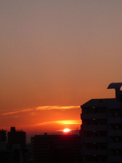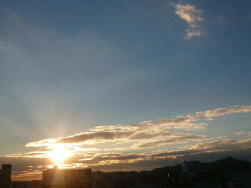 延原時行歌集「命輝く」 (第751回) 「復活の家出発進行ー感謝無限の旅一歩一歩」(162-4)原初の傾斜即風の歌、新著『宇宙時代の良寛・再説-「無→者」のためのホワイトヘッド風神学と共に』完成の歌、昨日書店にての歌、昨日の歌、道の歌、朗々の歌、しばた良寛講演「宇宙時代の良寛・再説-風の歌省察」にての歌、立つ場所の歌、妹背会話の歌、建学の精神稿の歌、二階の歌、しみじみの歌、この秋ほどほどの歌、いぶし銀本の歌など、夕餉の歌、三友便りの歌 (2013年10月9-18日) 10月12日 しばた良寛講演「宇宙時代の良寛・再説ー風の歌省察」にての歌三首 良寛の風の歌をばホ氏と共論じたる日の幸尽きざるよ (備考:我が想ひこれら人方の心と共にと思へば) 我語り告ぐるを目にて頷きて示す人方ほのぼのとあり (備考:我が語り目にあり) 焚くほどは風がもて来る言ふ時の良寛禅師心震へつ (備考:恩寵の風有難しとぞ) 10月13日 立つ場所の歌二首 宇宙には我が立つ場所を恵まるる毅然としてぞ立ち尽くすかな (備考:The Common Good awardに遂に教示されたる事) 先生よ年とったねえ言ふ人に何を頓馬な我が場所を知れ(備考:是無言の言なり。我が立所世界の友たち祝しおるに感謝無尽なれば青春真っ盛りなり見よ、これで二十年は長生きなるよ。世界の友の祝福ほどの薬なし御馳走なし。知らぬ人にはただ無言) 妹背会話の歌一首 今日はなあお寿司やでとぞ言ひたればうんと応へつ贅沢あかん(備考:偉い自制心強いんやなあ、ノーちゃん。父さんが口まで寿司運んだら物も言わずにぱくつくのん誰や) 「晩秋の須磨離宮公園ー洋ラン展」9回目、長くなりましたがこれで終わりです。この日は11月24日でしたから、もう一月もまえの写真でした。公園のもみじと洋ラン展、記憶に鮮やかです。今日も不安定な天候のようで、洗濯物は部屋の中です。この頃、すっかり日の出が遅くなりましたが、今朝の太陽が顔を出しましたので、カメラを向けて一枚撮りましたので、下に収めておきます。夕方には、今年最後の映画鑑賞で、三宮の方面へちょこっと出かけるつもりです。さて、本日もしっかりと、ばっちり仕事!仕事! お元気で!!