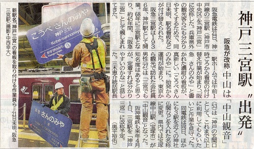 延原時行歌集「命輝く」 (第753回) 「復活の家出発進行ー感謝無限の旅一歩一歩」(162-6)原初の傾斜即風の歌、新著『宇宙時代の良寛・再説ー「無→者」のためのホワイトヘッド風神学と共に』完成の歌、昨日書店にての歌、昨日の歌、道の歌、朗々の歌、しばた良寛講演「宇宙時代の良寛・再説ー風の歌省察」にての歌、立つ場所の歌、妹背会話の歌、建学の精神稿の歌、二階の歌、しみじみの歌、この秋ほどほどの歌、いぶし銀本の歌など、夕餉の歌、三友便りの歌 (2013年10月9-18日) 10月16日 この秋ほどほどの歌六首 この秋やしみじみと享く御心の降り注ぎたる我が身我が時 このところ妻繰り返す一言や父さん好きや言ふものぞかし 嫁帰り誠奇跡の業ぞかし生くるほどほど我ら身に享く 生くるほど嬉しきことなしそれほどに恩寵身に享く有難きかな 先の「ほど」主体的なる事実なり而して後の「ほど」恩寵ぞ これをしもほどほどとぞや詠ふなりほどを生きつつかかるほど享く 10月17日 いぶし銀本の歌など五首ーー北越病院にて 我はしもいぶし銀本少なくも二冊有つなりややに売れだす 二冊とは至誠心の神学と地球時代の政治神学 この二冊時代の奥を穿つ本危ふき時代佑く本なり と書くうち延原さーん声すなり脳波検査に血液検査 眠いかねドクター尋ぬ眠いです検査緊張しましたと妻 滑らかな脳波の線を見つつ医師変わりないねとご託宣佳し 夕餉の歌一首 夕餉には美味考案す白菜のスープの上におでん豚角煮(備考:白菜と人参を出汁だけでたっぷり煮込みて市販のおでん一袋入るるなり。おでんのお汁効くなり。御椀に入れたるところに、豚の角煮乗せるなり。甚だ佳し) 冒頭の記事は、昨日(12月21日)「神戸新聞」の夕刊のものです。 昨日朝のテレビでこのニュースは目に入っていて、用事で三宮へ出かけたついでに、新しく書き換えられた「神戸三宮駅」をカメラに収めて、ここでUPするつもりでおりました。朝のニュースをみて、かってにこれはJRの駅名変更だろうと思い込んでいて、JR三宮駅を見回しても、どこにもその形跡はなく、いぶかりながら用事をすませて帰宅しました。ところが、夕刊をみると、一面に冒頭の記事にあるように、阪急電鉄「三宮駅」のことでした。この記事によれば、阪神電鉄も来年4月には「神戸三宮駅」に改称されるようです。JRはどうされるのでしょうか。「三宮」を「神戸三宮」に改称されるのは、たしかによいことですが、街の標識をみれば、どれもこれも「三宮」で、地元ではこのまま「三宮」でOKですね。久しぶりに「さんのみや地下街」(さんちか)をぶらりいたしましたが、阪神三宮の全面改装をはじめ、地下街の店もすっかり新しくなっていました。上の写真は、「さんちか」の風景のひとつです。今回は、どういうわけか、予定していた写真が収まりません。「一日の制限を越えています」というサインが出てしまいます。なぜでしょうか???暦の上では、今日は「冬至」。慌ただしい日々ですが、・・・・・よい一日を!