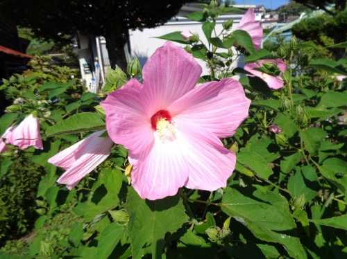 庭の花は春咲く花が多い中でフヨウ(芙蓉)の花は夏の一番暑い盛りに咲くのでひときわ目立ちます。花の大きさは、直径が10~15センチくらいあります。でも一日花なのは残念です。この花は枯れると椿のようにポトリと地面に落ちるのではなく、大きな萎れた花がガクの中に残って垂れ下がってしまいます。 毎年花が終わった秋、株だけ残して枝を根元から全部切ってしまいます。次の年の春先から枝芽が伸び夏になると大きな蕾が幾つもついて、次から次へと花が咲きます。 「芙蓉の高嶺を雲井に望み紫匂える武蔵野原に・・・」立教大学の校歌ですが、池袋キャンパスからは芙蓉峰(富士山)が見えたそうですが、埼玉県新座キャンパスからも見えるそうです。