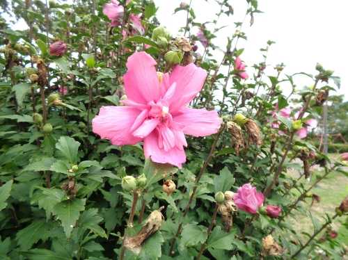 諏訪湖畔、下浜側に木槿(ムクゲ)の花が咲いています。色々の色や形の花があります。 中国名を「木槿(ムージン)」といい、その音読みが変化して日本では「むくげ」と呼ばれるようになったといわれています。 私はこの花の名を忘れてしまった時は、芭蕉の俳句を思い出すことにしています。「道の辺の木槿は馬に喰われけり」(野ざらし紀行)という句です。