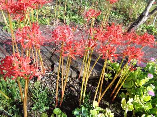 突然に芽が出て茎が伸び花が咲きました。今年は気候変動のため?花の咲かない花たちが幾つかありましたが、この花は例年通り咲きました。前庭のヒガンバナは先に咲いてもう枯れてしまいました(一番下の画像)。 彼岸花は呼び方が幾つもあるようです。曼殊沙華(マンジュシャゲ)は一般的です。リコリス、ハミズハナミズ(葉見ず花見ず)、天蓋花(テンガイバナ)、ラジアータ、英語名はレッドスパイダーリリー (Red spider lily(赤い蜘蛛の百合)くもの足のように細長い花弁が付いている)。 花が枯れると同時に根元から葉が出て来て、冬の間、緑でいますが、春になると枯れます。