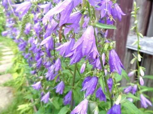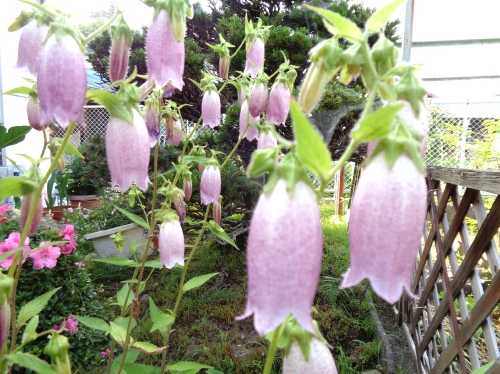 庭のあちこちに蛍袋の花が咲いていますが、此の場所の花はとても大きく背丈も高いです。日が当たる場所にあるからでしょうか。 広辞苑によると、キキョウ科の多年草。原野、路傍などに自生し、高さ30~50センチ。夏、茎頂に淡紫色の大きな鐘形花を数個下垂。若芽は食用。 蛍袋という名前の由来は①子供達がこの花にホタルを包んで家に持ち帰ったから、②中へ蝋燭などを入れだ照明器具の提灯(ちょうちん)を昔、「火垂る袋」と呼んだから、など諸説があるようです。