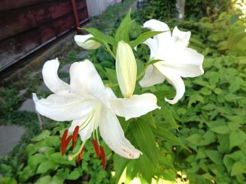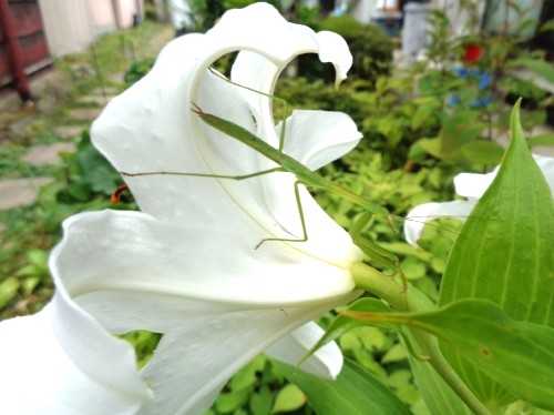 咲いているカサブランカの白百合にかなり大きなカマキリが留まっています。下を向いたままじっと動かないでいました。 小さいカマキリは、ハエ、アブラムシ、などの昆虫を食べるようですが、大きなカマキリは、蝶やトンボ、コオロギなども捕まえて食べるようです。二日ほどしたらいなくなりました。