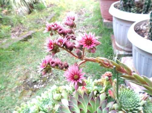 我が家ではセンペルビウムと呼んでいます。大きな鉢に苗を植え付けたものが、鉢全体に広がって今は溢れるばかりになっています。時々、溢れている葉を除去することがあります。突然に葉の中から20センチくらいの細い茎が持ち上がり、小さい花を付けます。大型のサボテンの花盛丸(カセイマル)は一日花ですが、このサボテンは、何日も咲いています。特には手入れも要らないので庭隅に置いてあります。