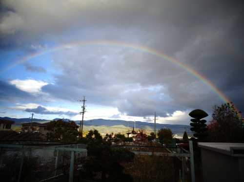 先日、ウォーキングに出掛けようとしたら急に雨が降ってきて中止しました。最近、晴れたり曇ったり、雨が降ったり止んだりで、秋晴れというような天気はなく、不順な天候です。 その日、諏訪湖の上に雨が降り、夕日が西山へ沈む時間帯に我が家の諏訪湖側のガラス戸から外を見たら諏訪湖の上に虹が架かっているのが見えました。