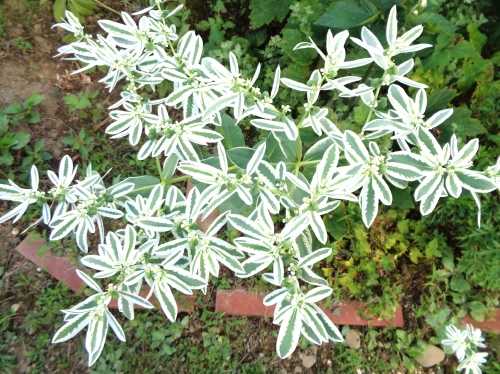 初雪草(ハツユキソウ)は、小さな花が初雪のように見えるわけではなく、葉のまわりが白く縁どられているので葉全体が初雪を被ったように見えるところからこの名がつけられたようです。 英名では、Snow-on-the-Mountainというようですが、この英名ををグーグル検索してみた処、膨大な件数が出てきました。外国では一般的な花なのですね。驚きました。