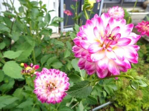 ダリアの花の咲いている期間は長く梅雨空の下で花が倒れたり、垂れ下がったりしている様は、かわいそうです。対策として花の立っている四隅へポールを挿して周り全体ををロープで縛ってあります。 秋になり花が終わった後で球根を掘り起こし、発泡スチロールの箱にピートモスを入れ、その中に保管しておきます。春先に地植えにしますが、球根の数が増えているので例年大体半分くらいは処分します。