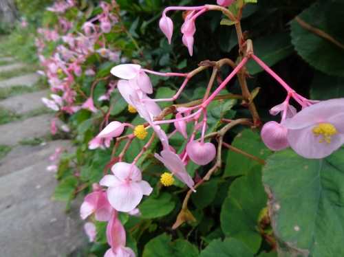 秋海棠が庭の敷石の横に咲いています。歩きにくいのですが、綺麗なので、そのままにしてあります。 雄花と雌花の形が極端に違いますが、雄花は花茎が短く花弁は4枚で横向きに咲き、花の芯は黄色のひと固まりですが、雌花は花茎が長く垂れ下がり、花弁は細長く、その先に小さく花を咲かせます。なぜそんなに違うのかよく分かりませんが、とにかく花には色々あるということですね。