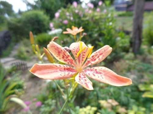 葉の並び方が、檜(ヒノキ)の薄い板をとじあわせた扇(おうぎ)のようになり、横に開いた形をしているので「檜扇」と呼ばれています。扇子みたいなものです。 この花の下に大きな黄緑色の苞ができていますが、花が枯れた後この苞の中に、黒い射干玉(ぬばたま)と言われる沢山の実ができて、熟すと割れて、中から5mmくらいの黒い光沢のある実が出てきます。10月には「ぬばたま」の実が生りますのでブログに載せる予定です。