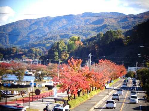 諏訪湖畔、県道岡谷茅野線に沿った街路樹の桜並木が紅葉しています。 横断歩道橋から撮影しました。この道路は諏訪地域では通行車両の最も多い道路の一つではないかと思います。