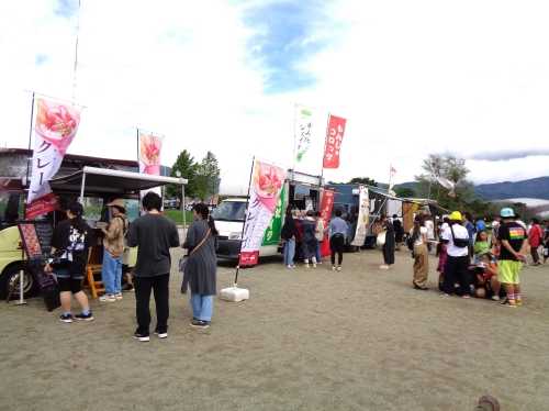 昨日、岡谷湖畔公園で開かれていたキッチンカー・フェスティバルを見てきました。 広場には大勢の人々が集まっていました。家族連れなどそれぞれに列を作って並び、好きなものを買い求めていました。
