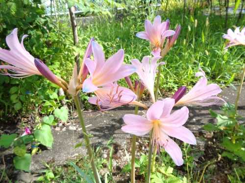 ナツズイセン(夏水仙)はヒガンバナ科の多年草です。ヒガンバナと同じように夏になると地面から突然に茎が立ち上がり、その先に水仙(百合に近いかも)のような花を咲かせます。葉は春先に出てきて、夏までには枯れています。 春の水仙には花によって色々な形や色の違いがありますが、夏水仙は、この形と色が主体です。薄桃色の中輪の花で、花びらの先がブルーを帯びているのが幻想的な色彩でが魅力です。 この花は色々な名前で呼ばれますが、リコリスと呼ばれることが多いでしょうか。