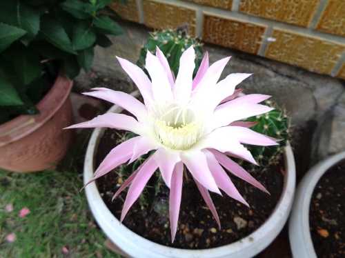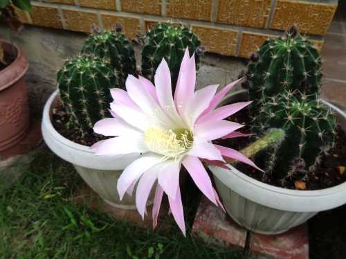今年の春先、このサボテンが傾いたり、曲がったり、大変な状況になってしまったので植え替えることにしました。大きく尖った棘(とげ)があるので大変な作業でした。高さを低めにほぼ統一して、何とか作業を完了しました。 同じ大きさに統一したのが良かったと思います。直径10センチほどの花が3個一緒に咲きました。しかし一日花ですので、その日のうちに萎んでしまいました。初めは全部捨てようかと思っていたので咲いてくれて嬉しかったです。