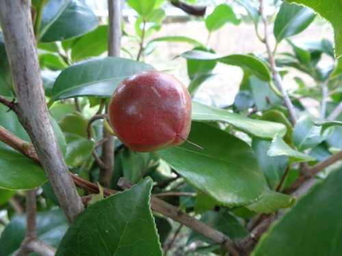 椿には実の生るものと生らないものがあります。我が家も3本の椿の木がありますが、3本とも勿論花は咲きますが、実はこの木1本しか生りません。この実が枝に付いたまま弾けました。 ツバキには品種によって実がつきにくいものもあるようです。