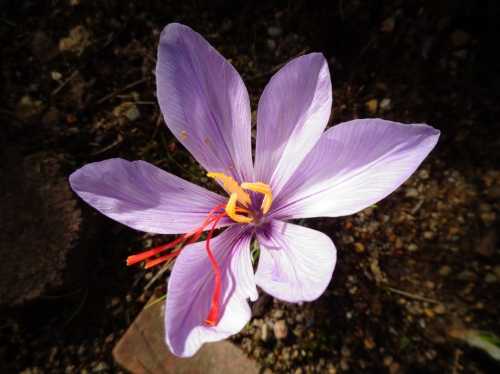 サフランの花は春に咲くクロッカスの花によく似ています。「秋咲きクロッカス」とも言うようです。 赤い色の3本の雌蕊、黄色の3本の雄蕊があります。雌蕊を乾燥させて、香辛料や生薬、染料として用いるようです。