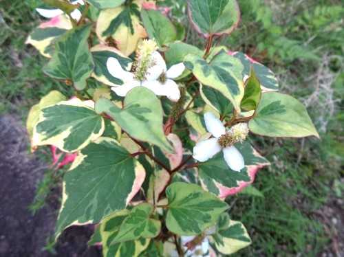 蕺草(ドクダミ)の園芸品種です。斑(ふ)入りドクダミとも呼ばれています。花は、普通のドクダミと同じ白色ですが、葉には通常の緑のほか赤や橙や中間色のような様々な色が入っています。葉全体を見たとき、葉が花のように見えてしまいます。 地下茎が伸びて、全然違ったところに芽を出します。庭全体に広がってはいけないので、芽が出た部分を抜き取るように気を付けています。