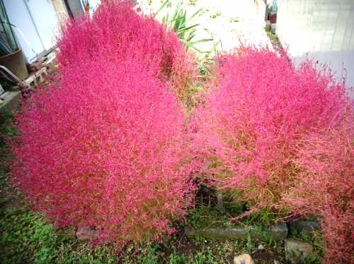 冬が目の前に迫っているこの時期に赤い色が残っていると可愛らしいものです。このコキアが出来ている場所は、花畑と通路が一緒になったような所です。 我が家のコキアは種を撒くのではなく、こぼれ種が芽生えたものの中から、邪魔にならない物を残すという程度で育てています。 枯れたあと紐で縛って箒にも使えるのでとても便利です。家の周りの所々にコキアの箒を置いてあります。