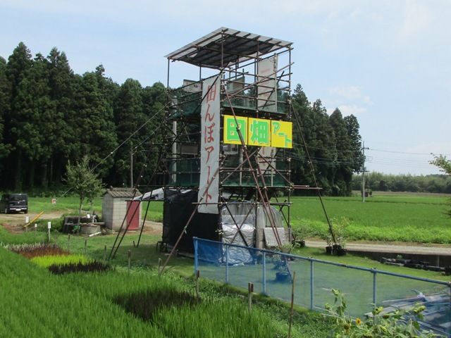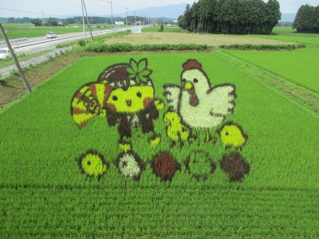 今日は火曜日でしたねお仕事お疲れ様です北の方から怪しい雲がお昼頃に通過予定予報が大当たりです降ったのは10分くらいでしたがバケツをひっくり返したような雨が私は早々と避難しましたが隣の工事の方は悲惨な目に今の雨は恐い海の日のお出かけ海の日なのに山の方へもちろん目的地は大きなお風呂ですがその前に寄り道新聞にも載って居たのでお邪魔してみました毎年行きたい行きたいと思ってはいましたがなかなか行けず初めてのご訪問階段を上って展望台に地元のゆるキャラとちまるくんと酉年にちなんで2人のコラボ稲がこのくらいの方が綺麗に見えますね毎年いろんな図柄を実施費用も結構、掛かるみたいですアートに使用している品種は10種類これだけ使えば綺麗に描けますね第2会場もあったみたいですが今回はパスだってナビに入れても表示されない