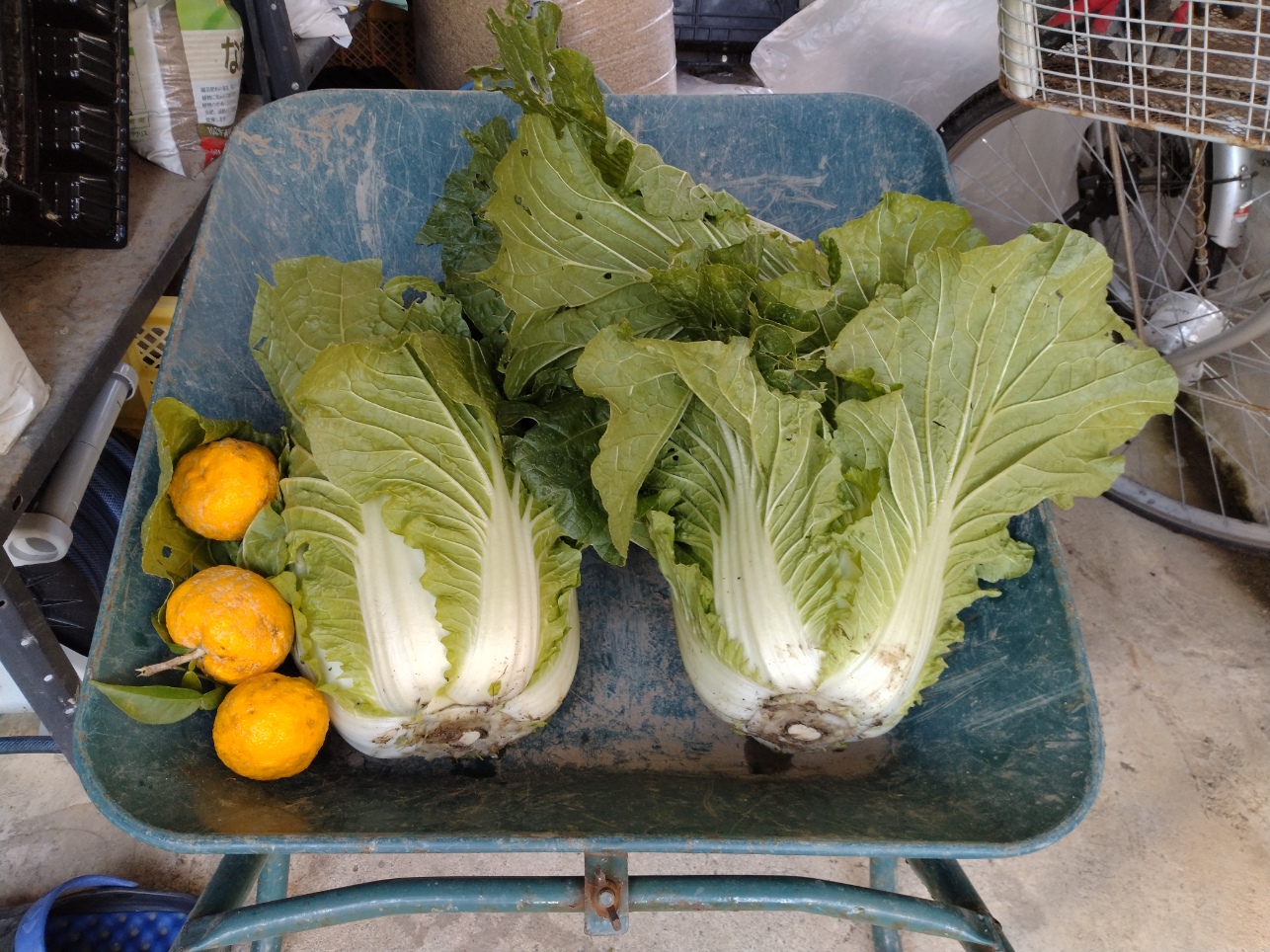 冬が近くなっていよいよ雪予報も出てくるようになりました。my畑はエリアで一番山沿いにあるため電気柵はかかせませんが、山沿いのため日照時間も短く、ソーラーでの稼働は厳しくなっていました。それで2年目で初めて単1乾電池8個を電源とする稼働に切り替えました。11月20日に電池にして乾電池がどのくらいもつのか実験です。しかし、1か月は期待しましたが僅か20日間でお終いとなりました。今のmy畑では人参がサルに狙われるので、この冬はやられるかもしれません。今は白菜が採れます。ちょうど鍋で暖まりたい時に旬の採れたて白菜、美味しいです。今年は異常気象のオンパレードで秋が暑かったせいか、白菜が玉になりにくい状態だったようです。自分とこだけでなく近所のベテランでもそのようです。外側の葉はもったいないので食べています。玉は詰まったというより緩めですが、綺麗なところは実家などへあげています。キャベツは葉は大きく張り出しましたが、まだ玉になりません。このまま雪の下になれば、春にしか食べられない。ブロッコリーは真ん中のはこんもりと収穫できましたが、そのあとには蕾ができてきません。まあ里芋と大根と白菜は、十分に食べられています。冷凍庫には網捕り鮎がまだ十分にあります。野菜と魚があることで、自前で食生活は成り立ちます。