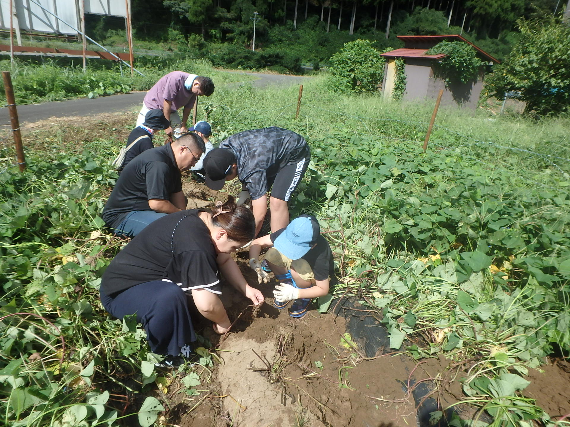 地区の中年会会長として、休耕の畑の活用としてサツマイモ栽培を提案し、5月に80株ほど植えて9月を迎えました。7月後半から8月には厳しい暑さと水不足もあったので、サツマイモ栽培初心者だったので、出来が心配でした。今回、中年会から地区の子ども会へ「芋ほり会」を提案し、9月23日にやりましょう!と快諾を得ました。地区子ども会は4家族で、お子様はどの地域も少なくなりました。今日は3家族の親子で参加いただきました。準備としては畑内は5畝(5列)栽培したので、1畝半ほど子供たちが掘りやすいように、弦をカットして、茎の根元を見せるようにして、黒マルチを剥がすことです。近所のベテランママさんの協力を得て、スムーズな芋掘りが出来ました。事前に3か所ほどで芋が付いているか試し掘りをしています。9月中ではまだ少し早いかという気持ちでしたが、紅はるかのどの茎にも芋は付いていました。数は2~5個くらいが多かった。もう少し大きくなるような気がします。子供たちも頑張って掘ってくれて、5畝中の2畝は彫り出しました。細かいのを入れれば80~90個の芋が採れたと思います。あと3畝の芋は神社の秋祭りに合わせ、地域のご家庭にあげる予定です。