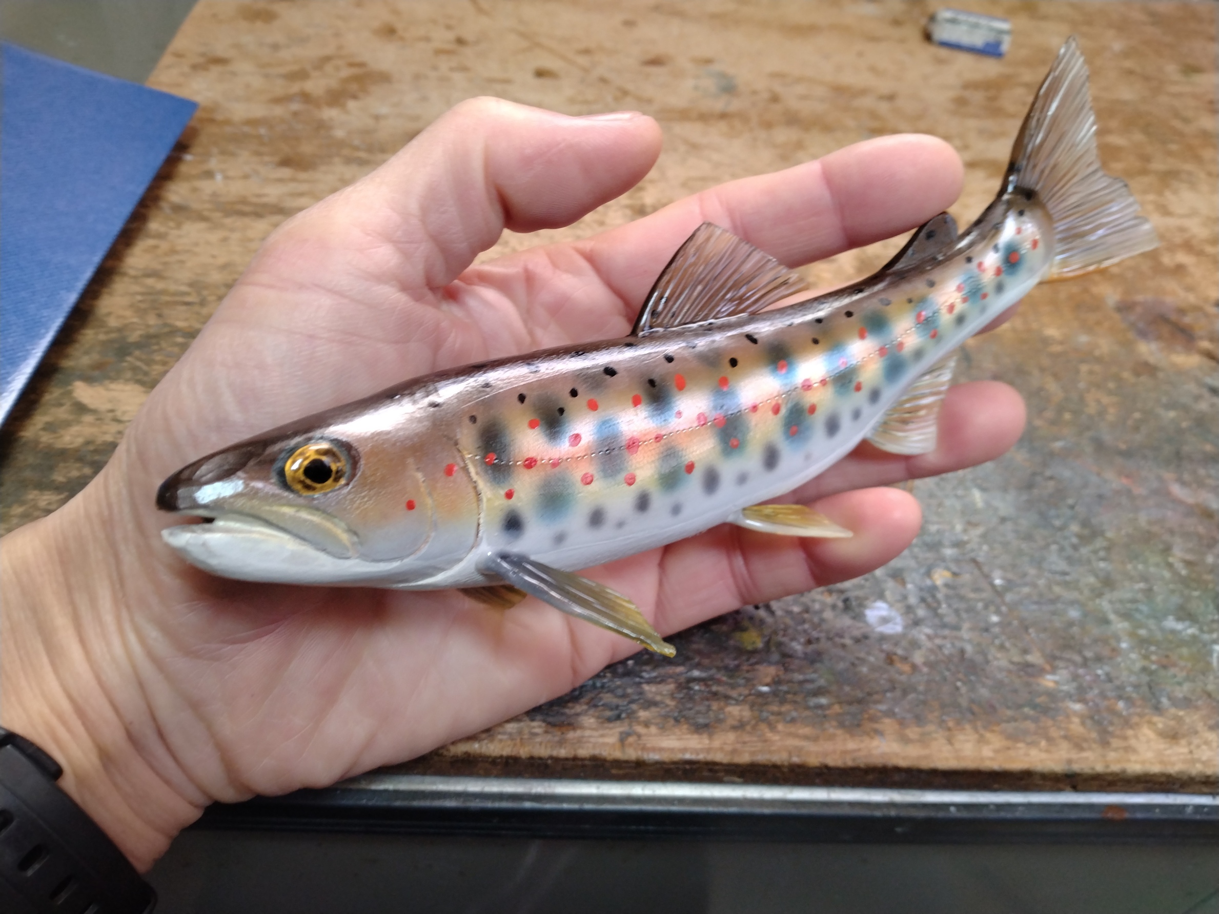 この冬は、20cmサイズフィギュアを作成していました。鮎を何体か作って、次にヤマメ&アマゴに進んでいます。アルミ箔貼って鱗模様を付ける工程は、ヤスリにアルミをこすりつけるやり方です。これまで全長20cmサイズを作りたかったのですが、持っている金属ヤスリのサイズに対して、魚の体をひねった形の曲面体にアルミ箔を張るには難しさがありました。これまでは15cmサイズくらいまでが限界でした。この冬でそのサイズの壁を何とかクリアしました。アルミ箔の上にエアブラシでアクリル絵の具を吹き付けるのは、とても光沢が生きてきます。つまりはハンドメイドルアー製作手法と同じです。そして今回は、ヤマメ&アマゴのパーマークをこれまでのステンシルからフリーハンドの吹き付けに変えました。20cmサイズがそうさせました。ステンシルを当てるのはそれほど長い範囲を吹き付けるのは、端の方ほど浮いて難しくなります。ヤマメとアマゴは朱点のほかボディ色を少し変えました。今、最終コーティングの2回目に入ったところです。新雪の上で画像に収めました。なかなか良い出来栄えです。流木の上に飾る予定です。