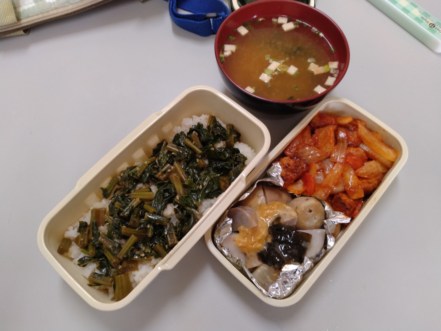 大根の葉っぱを炒めて甘くどくして、ご飯にかけると美味です。ブロッコリーの茎の短冊切りとウインナーを炒めました。妻の母親93歳が転んで手や顔を骨折して、実家での付き添いが必要になり、私は独身で11月の大半を過ごしていました。そうなると、どうする食事!となりますが、やはり僕は料理は好きなようです。野菜は畑で作っているし、冷凍庫にアユは保存している。そればかりでは飽きるので、揚げ物や肉などは週に2回の買い物でキープしました。でもほとんど秋収穫の野菜を優先して食べました。一つは柚子が採れるので、柚子味噌を作ります。柚子の皮は裏の白い部分が苦みが出るので、ギザギザ付きスプーンで白いのを落とします。黄色い皮をみじん切りにして入れます。すりおろしやミキサーではゴロゴロ感が無くて、食感も風味よくありません、あくまでみじん切りです。そして秋に採れた里芋や大根を大きく切って、昆布だし+ほんだしで水炊きして柚子味噌で食べます。これ温まるし秋らしい贅沢です。この時期芽が出てきたジャガイモも使わないとで、肉じゃがや、イカ缶詰で作るイカじゃがでよく食べました。イカは最近高いですが、イカの缶詰で安くて130円で汁の多いのは、まるごと入れて良い出汁も使えるので、砂糖と醤油を追加するだけで良い味に仕上がります。そしておかずは多めに作って翌日の弁当に入れます。見栄えまでは気にせず、一人暮らしは賞味期限を意識しながらそこにあるものを入れることだけです。それでも満足できる日々でした。人に見せるわけでなく贅沢したいわけでないので、気楽な弁当づくりでした。