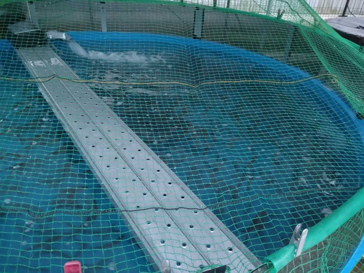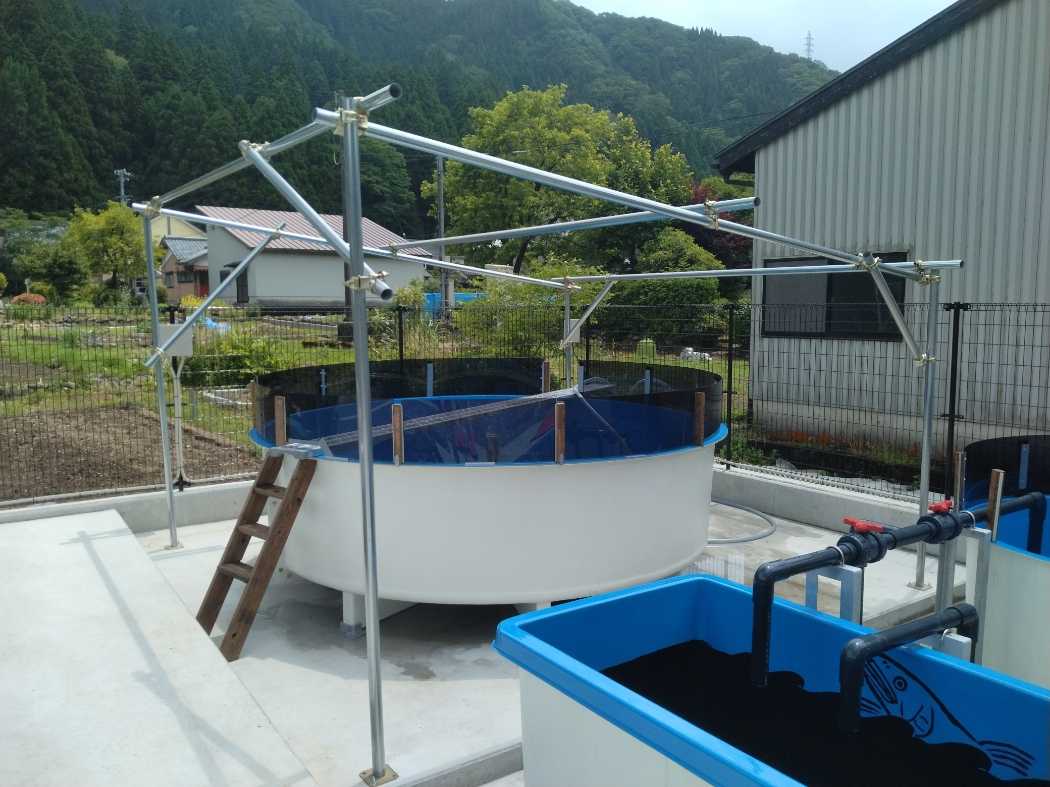 塩ビパイプでキレイな円が作れます。梅雨明け宣言のころになりました。漁協のオトリ鮎の水槽では、夏の太陽の照り込みや、気温上昇による水温の上昇も誘発されてか、鮎がやたらジャンプする機会が増えました。これまで抑えられていたはずの飛び出しが急に多発して、水槽外で死亡する鮎が出てきたので、急遽その対策をしなくてはいけません。鮎が死ぬので、大至急のタスクです。防草シートを使うのはすぐに考えました。その周囲をガッチリ固定するのを、コメリで長い塩ビパイプをしごいていてこれは出来るかも!と思いました。家に15年前に融雪パイプとして購入し、野外にほったらかしの20mmの古パイプが8m以上ありました。それにストレートの接続具(100円もしない)を2個購入。それで直径1.75mの円を作ります。それはストレートの接続具には負担はかかりますが、逆に1.75mの大きさならストレートで収まるんです。曲がりクセは残っていましたが、キレイな円が作れました。普通UVで劣化するのが樹脂製品ですが、塩ビパイプのこの耐久性は推奨ものです。それでも用心のため、接続具のところは万一外れないようにテープを巻いて固めます。そして防草シートを縫い付けました。網修理用の「舟」を活用して、防草シートのすき間に差して縫うわけです。防草シートの硬さも水槽のフタとしては有効でした。これが遮光シートで選ぶと柔らかいので真ん中が垂れるし、フタとして頼りなかったでしょう。もちろんその後、鮎の飛び出しはこの場所では防いでいます。