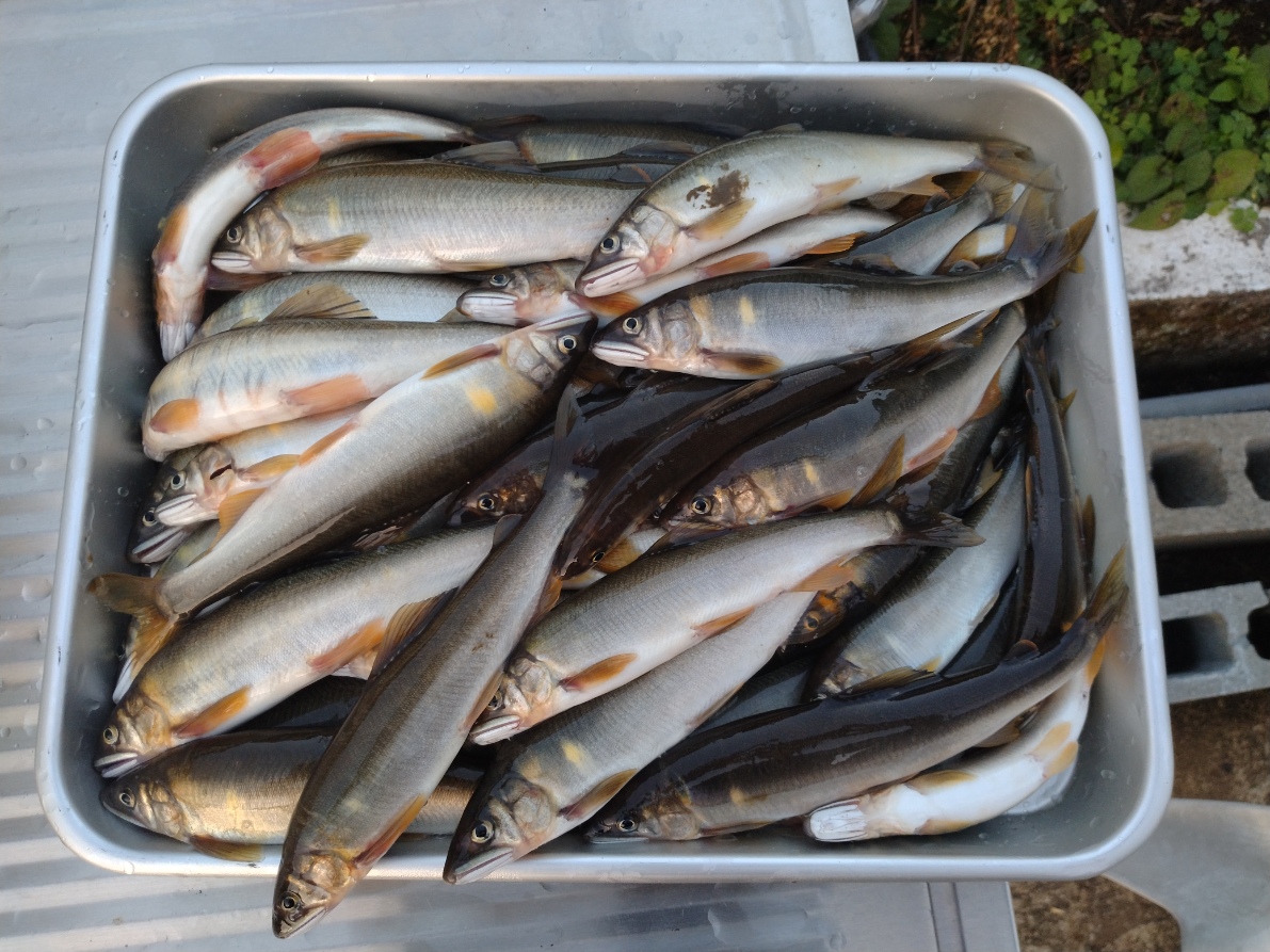 昨年まではオトリ屋として、9月以降は網捕り天然鮎をオトリとして出していました。今年は7月末で、個人のオトリ屋は閉店したので、網をする必要は無くなりました。体力的にもあまり元気が無いので、網はしていませんでした。それでも今日、気分転換に1年ぶりに網をしようと思いました。そしたらお昼前ににわか雨が降り、中流域で1時間に23mmのまとまった雨。その結果、一時15cmほどの増水となり、濁りが出ていました。これはまたとない機会です。午後4時を過ぎたので、網道具一式を準備し、出動。場所はアウトドア小僧下から上流方向です。低い堰堤の方向へ進みます。水位は5cmほどは高め、薄茶色の濁りが残っています。鮎は賢いので網が始まれば学習し、そう簡単には網に掛からないが、この濁りのおかげで面白いように網に掛かりました。長くやるつもりは無かったので、1時間半余りで44匹。距離的にもこれまでにない短い区間です。いつもは必ず堰堤までは巻いて上がるしその堰堤の付近が一番捕れるが、数的にもう満足したので早めに上がりました。サイズも良型が多かったです。
