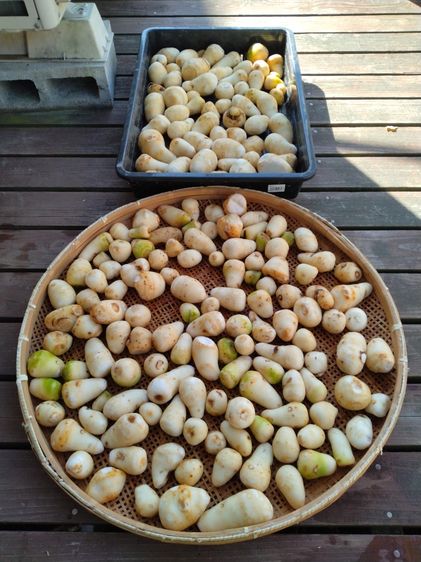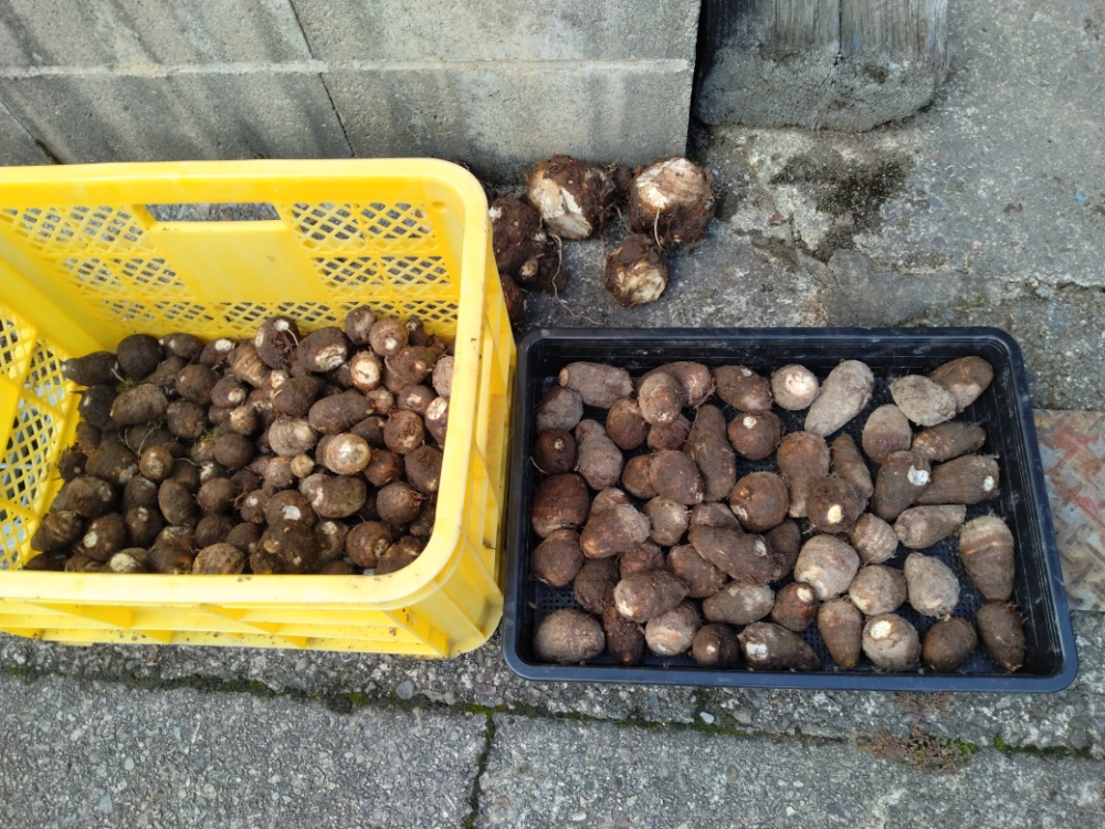 サトイモ栽培はまだ2年生。今年も20株ほど植えて、9割は大きく成長しました。昨年は暑い夏にせっせと水やりを欠かさずやって、近所のおばちゃんが褒めるほどの出来栄え。今年もそれ以上に、雨が降らない厳しく暑い夏でした。今年も毎日に近いくらい水を運びました。近くの水路にはわずかな水しか流れませんが、道路下が暗渠になる溜水でバケツ7杯くらいの水が溜まっているので、それを大事に運びます。秋になり他所のサトイモよりやや早めに、上物の葉が倒れてきているので、10月20日に今年の初収穫をしました。掘ったのは4株なので全体の1/4くらい。しっかり子芋が付いていました。半日乾かして土と長い根が絡んだ子芋を外していきます。黄色い収穫用ケースの半分くらいはありました。その後は土を落とし洗わないといけません。この黄色の収穫ケースに入れたまま、上にネットを被せ、ネットを強力ゴムと荷造りベルトで縛り、用水路の流れの落ち込みにセットします。流れて行かないように小石もいくつか入れます。これらが流れでケース内でグルグル回ることで、サトイモがキレイになります。途中2時間半経過後見ると、まだ外皮が取れて無かったので、翌日朝まで15時間も水路の滝水を浴びせました。おかげで芋は真っ白になりました。時間が長すぎてすり減って小さくなる?と思いましたがそんなことは無いようです。今日21日は晴天だったので、天日干しして乾かしました。この作業の流れは満足です。