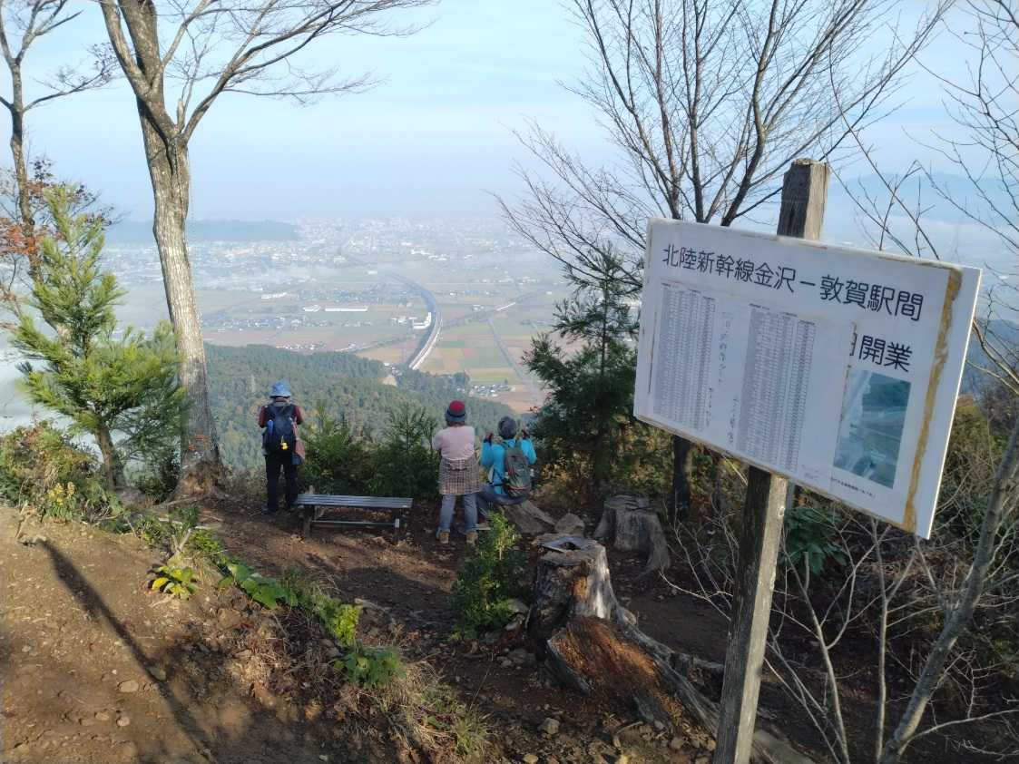 一つ上の方が、文殊山(365m)に、足腰の鍛錬に良く登ると聞いて、一度は登りたいと思ってた。昨日11月16日は、この時期にしては暖かい穏やかな予報だった。これを逃しては、今年登れなくなると思い急遽山へ向かった。靴は息子の高校時代のズック(まだ靴裏の溝がしっかりしていた)福井市二上町の登山口へ着いたのは8時50分くらい。その時点では、3か所ある駐車場の1個半くらい停まっていた。登山道は幅も広く良く整備されて、急なところは段が2列に付けられていた。登山客が多いので交互通行も出来る。早速下ってきた客と、あいさつ励行。このあいさつ励行が登山の気持ちになる。登りは苦痛ではなく、休憩なしで、時々前を行く方を追い越しながら50分ほどで山頂へ。山頂は北陸新幹線のダイヤ表があって、北西方向に延びる新幹線ルートが見下ろせます。その方向で新幹線待ちの方が何人か休憩していました。本当に天気が良く眺めは良かった。ただ、ここも紅葉はスッキリしてなくて「紅葉景勝地」の看板の場所でもたいしたことはありません。登山は若い時から下りで膝が痛くなるので、アウトドア好きでも回数は多くありません。今回久しぶりの下山で左ひざが痛くて、途中から左をかばいながら無事下山。いつもは膝の痛みは当日のみで終わりますが、今回は翌日も尾を引いている。足腰が強い?つもりでいたがこれも高齢化なのか。