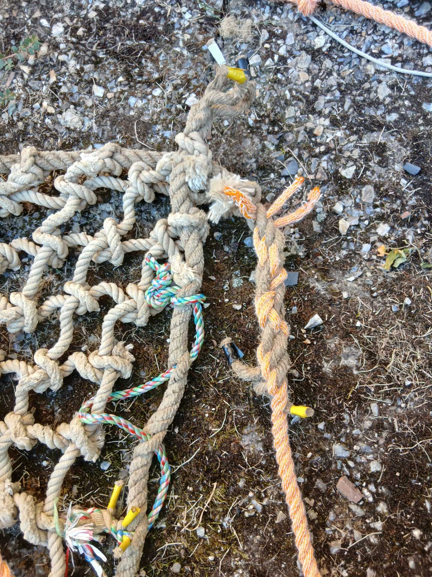 もっこと言ってもピンとこないと思います。荷揚げ用ではなく、用水路の泥や藻を引き上げるときに使う、水を濾して目的物だけ上げる道具です。これが作業するたびに、引き上げ部のロープが切れたり不具合多いので、代替品を探していた。結果、代替は大きすぎたり、網目が合わなかったり、高い割には作業に間に合わない可能性が高いので、用水担当の自分で補修することに決めた。12mmφのロープは、耐水性→耐久性→軽さなどを優先して選んだ。オレンジ色メインで白い糸と混合のやつです。さて、ロープの結束や接続に知識が無い。YouTubeで検索するとすぐに目的サイトに行ける。本当に便利。しばし画面で確認しながら細いロープで試運転。実際は接続するには片方が短くて厳しい場面もありました。それでも自分の力での引っ張りには十分耐えられるので、大丈夫でしょう。今回は、引き上げ部には、結び玉を2個づつつけて滑り止めにも配意。作業代はボランティアなので、ロープ代20m分だけで終了しました。