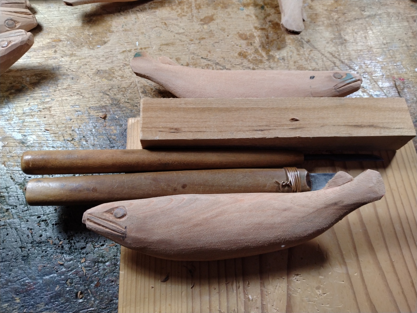 鮎シーズンが終わりました。私にとっては、漁協のオトリ施設からのオトリ屋への配送が9月末日で終わるので、それがシーズン終了です。その施設の元水道用の井戸を使えるのが6月から9月末までの契約なので、私のシーズンははっきりしています。今年も鮎のデリケートさに悩まされましたが、2年目としてある程度慣れが出てきたので、何とか精神的にも体力的にも大丈夫に過ごせました。オフシーズンは毎度ながら木工に進むわけです。今年65になって、年金があたる節目となっていて、少しづつ体力の衰えも進む年齢です。体力というより「目」や指先の感覚が心配になっています。それで今回は3年ぶりに小物アクセサリーを作り、状況を見ることとしました。鮎の尾の反転デザインのブローチサイズで進めていました。手順は、桜の木の加工から、木彫りを行い、アルミ箔を貼り、色付けに進みます。木彫りでは、久々に刃物を研ぎました、これが精神静養に良いです。良い道具を良い状態に保てないと良い仕事はできません。そして色付けですが、最後の目の着色について、視力や指先のデリカシーが鋭敏でないと、良い表情が作れないんです。一連の作業でもっとも年齢的に難しくなる作業です。ブローチサイズでならこれまでとそん色ない作業が出来ました。もう一回り小さいタイピンサイズなら、今は難しいかもしれません。まだ衰えはほとんど無いということで、楽しく工芸を進めています。