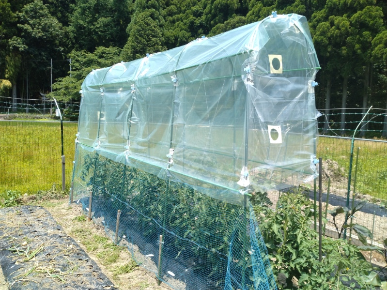 高い高い!トマトの雨除け虫食いトマトが黒マルチの上に並びます。畑作りの2年生。昨年初めてのトマトが上手くいった方なので、今年は8本苗を植えて、接ぎ木でない安い苗ですが順調に来ていました。雨除けのビニール屋根も、地区で一番の高さで覆い、去年が3段目まで収穫だったので、実が成る4段、5段目を目指していました。トマトは水はけの悪い場所はダメなので、今年の長雨とジトジトには堪えれるかと思いきや、それには問題なく、既定の3段目までの実は十分に成っていました。しかし、もちろんの無農薬ですから虫の被害が広がりました。蛾の幼虫がいたるところで穴を開け始め、昨年作っておいた「酢+ニンニク+鷹の爪」の漬けたのをスプレーでかけました。これは効き目はあるようですが、やるのが遅かった。実の奥に入った虫には効きません。結局。虫食いのある実は処分しました。隣の畝は、玉ねぎ収穫のあとのマルチですが、そこにトマトの実が残念な形で並びました。今日の猛暑日で、晴れ間が多くあり、遅まきながらトマトは色づきました。トマトは難しい!が近所のおばちゃん評ですが、私もトマト栽培の難しさを身に染みています。