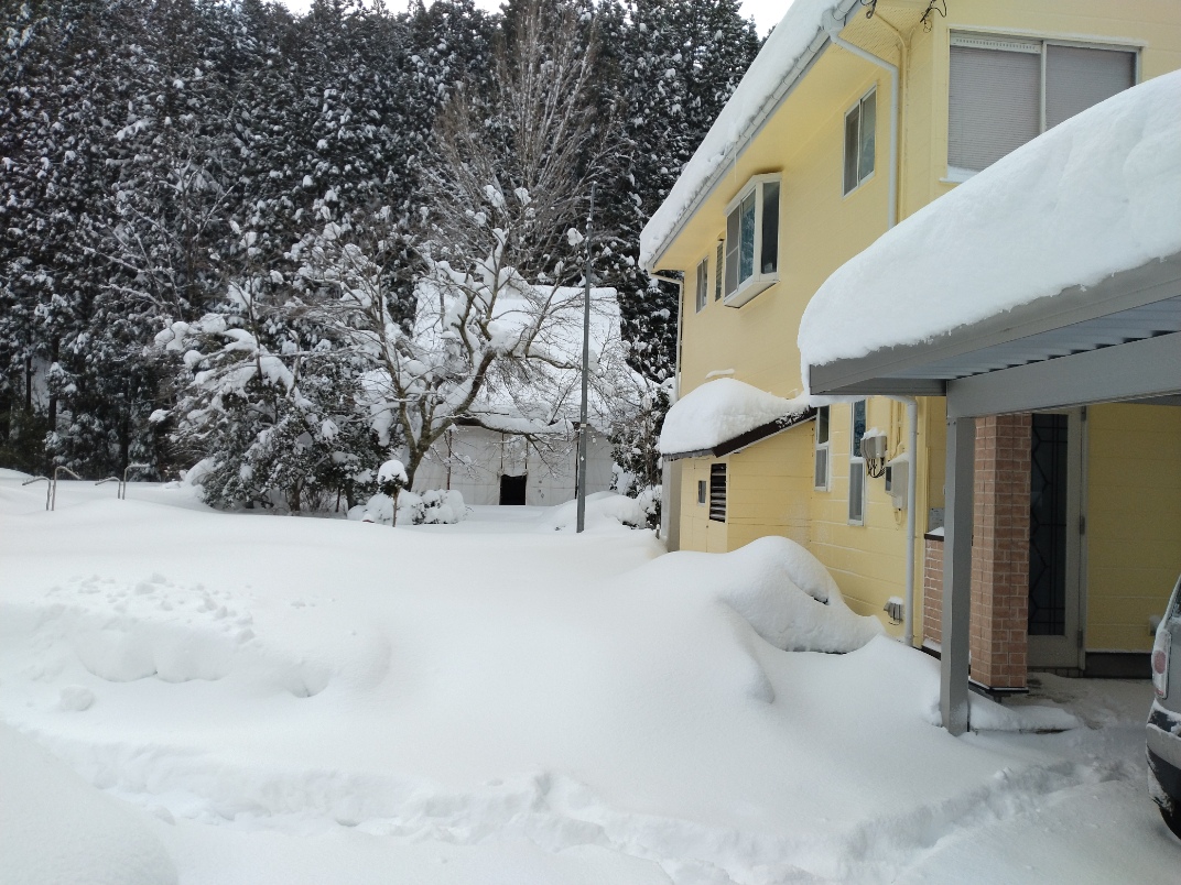 2025年 年明けから異常にあったかでしたが、2月になり一転大雪になりました。今シーズン大雪になるといった長期予報がここにきて当たってしまったということです。大野で1.4m、福井で50cmなので、その中間の美山は100cmほどの積雪になりました。我が家は、25年経過の安かったポリカ-アルミの片足カーポート(一度雪折れしたのを補強して使っていた)をあきらめ、積雪型のセッパンカーポートに半年前に入れ替えたので、この雪でも頑丈で安心して生活できます。これまでは夜間に40cm積もると倒壊するので、寝る前の寒い時間に片足カーポートの雪下ろしをして寝ていました。我が家は屋根雪下ろしに上がる家ではないのですが、生家=親の家は古くて屋根の多い家なので、この土日に雪下ろしが必要と感じていました。親に頼まれたわけでなく8日に屋根に上がりました。屋根の1/3だけ落とすことで、1時間半ほどで手早く作業をやりました。もう慣れたものです。 しかし、甘く見るとやはり危険で、向かいのオトリ小屋の下屋はトタン屋根ですが、ハシゴ掛けた付近の足元の雪がずり落ちて、危うく転落しそうになりました。ハシゴも屋根から離れて降りれない状況。一人作業はやはり危険です。飛び降りしか方法がなくなります。幸い宙に浮いたハシゴに長い柄のポリスコの柄を掛けて引き戻しました。