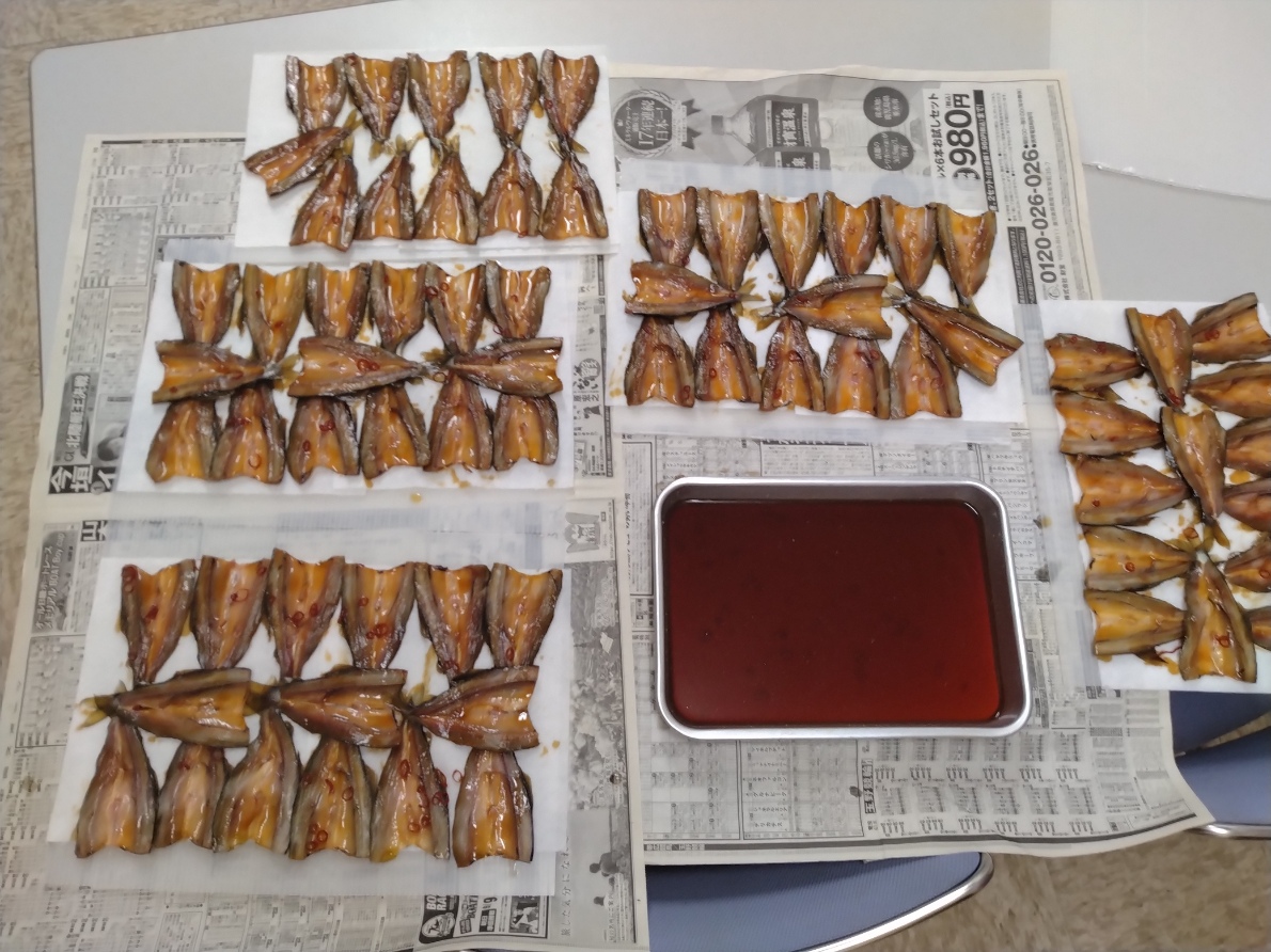 2024年シーズン、いきなり中流で3m近い増水その後も雨が続いて、白川アカ飛びもあり、川に人が入れる日は少ないです。今年から漁協のオトリ施設の管理もしているので、それもマジ初体験の初年度であるので、この大雨と川に人が入れない状況が続くのは、オトリ屋を17年しているとはいえ、読み切れませんでした。オトリ施設の能力も、試しながらの運転で、どれくらい日数が経過するとオトリがダメになるかデータがありません。解禁前13日に入荷した鮎は、12日ほど経過で傷んできました。私も正味2週間という意識はありましたが、鮎というデリケートな生き物を飼うことがいかに難しいか。水は井戸水ではあるが、水の成分にも個性があり、ピタリ鮎に適合しているかは分かりません。27日の出荷は、ダメになった鮎を選別しながらの作業になりました。数を読まなければいけないが、選別作業で数読みが揺さぶられる。選別も生き物なので裏表くまなくチェックが出来ないこともあります。作業は平常時の倍以上かかりました。雨は7月スタートでも1週間以上続く予報が並びます。釣り人は、雨が外れた日を狙い川へ出動するが、各オトリ店にオトリ鮎を配送し在庫を維持するのはかなり難しい作業と言えます。画像は、処分した鮎をみりん干しに加工。まだ1回目だからやる気はあります。これが続くと加工を継続する気持ちにはなれません。