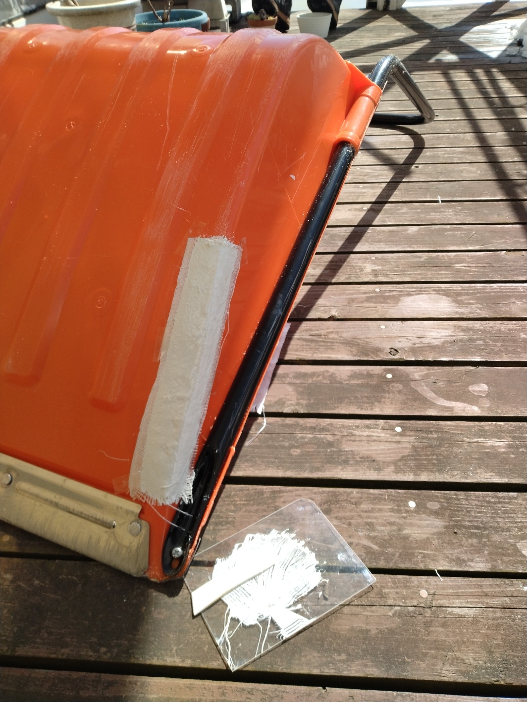 2月は意外な大雪になり、雪かき道具は活躍します。ママさんダンプは鉄製と樹脂製とありますが、降りたての雪には樹脂製が良いです。しかし我が家は雪捨ての水路までが遠くママさんダンプを道路にこすりながら運ぶことを繰り返します。もちろん雪を少し残して地面との摩擦は軽減していますが、いずれすり減るとは思ってました。そして今回の大雪で、何か変な音がするなと見ると、ママさんダンプの右角がこすれて15cmほど裂けていました。丈夫なタイプをよく選んで5年ほど前に買った、お気に入り道具です。2月17日の週からまた大雪の予報が出ているので、新しいダンプを買いに近くのコメリ、次は大野市のパルスへ行きました。もう先端を金属で頑丈にカバーしたダンプはありませんでした。これでは降ってしばらくたったザラメ雪には使えない。しぶしぶ先端樹脂カバータイプのを買いましたが、裂けたダンプを何とか直したいと思いました。その昔、カヌーに乗っていたので、補修用にFRP補修接着剤の残りがありました。その残ったガラス繊維と溶剤で補修開始、30年前に買ったのに未だに混合すると臭い接着剤です。1つの溶剤はキャップが硬化して、やむなくチューブの尻を切って出しました。それだけ古いです。足つきをよくするために、フラットな部分はルーターでざらざらにしました。ガラス繊維をあてがって接着剤を乗せていきます。意外と乾きが早くて、裏面にも残った少ない面積のガラス繊維をあてがい白い接着剤を塗ります。半日もかからず完了。これまで浴槽の補修では使いました。今回の樹脂との相性はわかりませんが、今のところ使えるようです。ママさんダンプ捨てれば粗大ごみ、先端が金属カバーで強くほかには傷んだところはなし、これは他の場所が痛むまでは騙し騙し?硬めの雪の場面で使いたいものです。その後、5回ほど使用したところ、裏表に貼ったFRP補修材+ガラス繊維は剥がれました。最初、接着の食い付きも良く、耐久性はあるように感じましたが残念な結果になりました。まだ、補修はあきらめていないので、次はアルミアングル+ねじで固定する方法をとります。