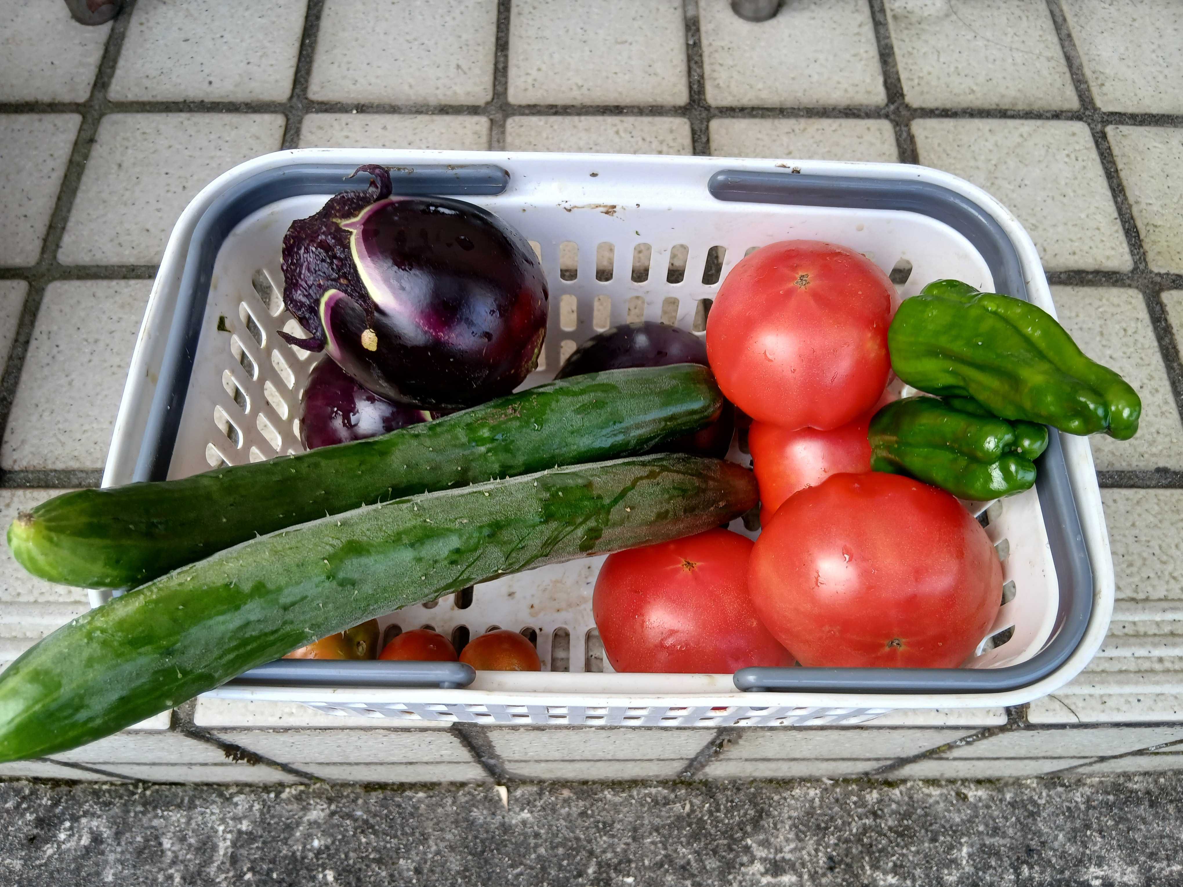 6月末から事実上の梅雨明けとなり、35℃以上の猛暑日も連続したりしています。6月上旬から採れたキュウリは一時的にはしおれて、7月になるといったん成らなくなりました。ナスは高温に強いのか、安心してみていられました。ピーマンは4本の苗を植えましたが、2本は早々に枯れてしまいました。そして毎年失敗するトマトは今年も難しい状態になっています。大玉、ミディ、ミニと3種類の苗を2本づつ植えました。それらはほとんど萎れてきました。完全に死んだか?といえば2~3本は辛うじて実をつけたまま色づきを迎えてはいます。ともかく水をやるようになりました。朝は忙しいので、日の入り後にバケツで十分に水をやります。キュウリは新しい弦が伸び始めて、再び実がなるようになりました。トマトも見た目は可哀そうレベルですが、今日もしっかり熟した実を4個もとることが出来ました。サトイモを25本ほど植えていますが、今年はズイキが小さくて貧弱に見えます。もう大きくは広がらないが水をせっせとやっています。サルやイノシシからは電気柵でしっかり守っていますが、この異常気象の猛暑・高温は、野菜になかなか厳しい試練です。スーパーでも夏野菜の高騰がニュースで伝わります。