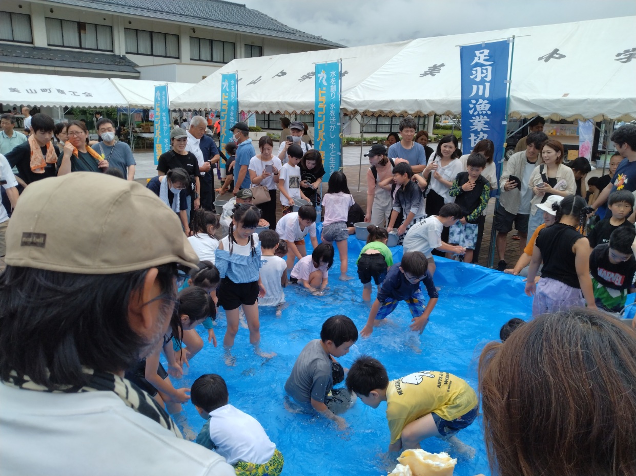 7月14日(日)に美山ふれあい祭りがあり、そのイベントの中に「鮎のつかみ取り」がありました。今年から、その鮎の注文(200匹)は漁協にあって、漁協の施設から私が配達しました。その日は日曜日ですから、私のオトリ屋にお客さんも来る。作業が無事に出来るか不安があり、朝4時半から作業スタート。6月の夏至以降少しづつ日の出が遅くなり、雨降る4時半はまだ暗い。生簀から150匹を捕まえて、数を読み、直ぐに出せるようにウナギかご(大)2個に分けて入れました。そして早めに焼き場で塩焼きにする50匹は、氷締めにしてアイスBOXに入れてスタンバイOK。「雨のおかげ」でオトリ屋への注文配達は無く。小僧のオトリ屋へのお客さんもほとんど無かった。今年は雨が多く、雨と増水にやられ鮎業界はやきもきしている中、「雨のおかげ」という不謹慎な表現ですが助かりました。イベントがある10時過ぎから雨は止み、子供たちは特設のつかみ取りプールの中で、すばしこい鮎に翻弄されながら楽しい歓声が響き渡りました。昨年は水が少なくて直ぐに捕まえられたようですが、今年は水を多めに深くしたので、つかみ取りは長く楽しめました。ブルーシートと木枠で作った特設プール。水は漁協オトリ施設から4回、計4000リットル運びました。地下水で16~17℃くらいです。冷たい水でも子供たちはたいへん元気でした。