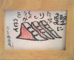 お店に飾られている一枚の絵ダレの作だろ??落款も押されているので・・相当価値のある絵だとおもう。作者の名前が読みづらいが・・「おいしさ伝道庵」と書かれている。たぶん・・山下清画伯に、体型と顔とボウズ頭だけは似ている・・作者だと思う・・さてさて・・昨日の晩酌は「かつお」でした。下りカツオ・・とも、戻りカツオとも呼ばれている今の季節のカツオ。昨日は・・御前崎直送の生のカツオを食べたのだが・・まだ・・ちょっと時季が早いのか、脂のノリはイマイチであった。皮の下の脂がいまいち・・サシが入っていなかった。さてさてカツオは「目には青葉・・・」の時季と、9月後半からの季節と二度の美味しさを味わえる。俗に言われている・・「初カツオ」は・・初夏のコロのカツオをさす。江戸っ子が・・女房を質に入れても・・・食べたいのが・・初カツオである。浜松っ子はどちらかというと・・初カツオ(通称 もちカツオ)を好む傾向があるが・・私はカツオであるならば・・初夏のコロのもちカツオも好きだが・・今の時季の「戻りカツオ」も好きなのだ。これからのカツオ・・脂がのっていて・・トロカツオなどとも呼ばれるものだ。これがまた・・酒に合うのょ・・・少しカツオ独特の「鉄」の味を感じるが・・・脂ののりかたが・・マグロのトロよりも・・・いい感じ。私個人の意見であるが・・・マグロの中トロよりも・・かつおの脂のほうが好き。今の時季・・・少しぬるめのお燗と合うのよ~昨日は・・・日本酒を「冷や」だったけどね・・かつおの旬が二度ある・・っていうのは・・なんか幸せな気分になります。