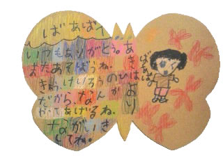 娘アッキが・・お店のテーブルでなにやら描いている。旧店舗から母親がやってきた。店内に入ってきた母親に対して・・「ちぃばあば・・あっちへ行って、こないで!」アキハの会話にちょっとムッとした私の母親。その場の空気を察した私は・・「そうだ・・・ちいばぁば、今日はどこかお蕎麦屋さんでもいいから、外食でもしておいでよ」突然の私の発言にさらにさらにムッとした顔になった。アキハは全身を使って・・手紙を隠している。私は急いでボールペンを走らせ、なにやら書き込みしたメモを母親にワタした。アキハには見せないように・・そのメモには・・「じいじ、ばあばにお手紙を描いているから・・席をはずして」このメモに・・・母親はようやく納得。なんだか・・疎外というか、無視されている・・と思いこんだのかもしれないね。そして母親はじいじを連れて・・・どこかのお蕎麦屋さんへ行ってくれました。アキハとトシヤ・・・じいじとバアバがいないうちに・・・、こんなお手紙を完成させたのです。こんなカワイイの・・・本人を前にしたら描けないよねぇ・・うちの母親も「あっ・・もしかしたら」と思って・・・その場の空気を読んでくれたらいいのに、娘アキハの「あっち行って」の言葉に本気でムッとしていたもんなぁ。なんか・・疎外感をかんじるのか・・「あっち行っていて」の言葉に敏感です。こんなに素敵なハガキを描いてくれたアキハでした。