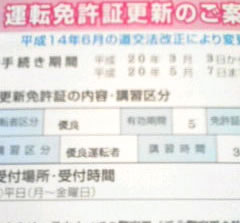 3年ぶりに・・・見事・・復活。返り咲き。前々回・・・見事ゴールドに・・・しかし、その一ヶ月後・・簡単な人身事故。お年寄りの方と信号の無い交差点で軽く接触。ちゃんとこちら側から警察を呼んだのだ。相手が自転車だったので・・・そんなに大きなケガでは無くて良かったが・・そんなこんなで・・・この3年間は普通のブルー免許だったのですが・・・あの人身事故から8年・・・無事故無違反でやってきました。そして今回・・・3年ブリのゴールド復活。見事・・ゴールド免許に返り咲き。8年間・・無事故無違反はけっこう頑張りました。昔・・20代のころは・・酒気帯びで・・一発免停・・・なんてこともありましたが・・・今はそんな悪いことはしていません。みなさんも安全運転を・・・・くめっち・・見事・・3年ぶりのゴールド免許・・返り咲き。