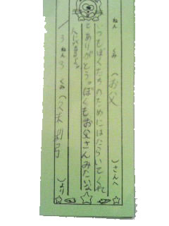昨日は地元商店街の有志の集まり・・・まあ・・酒を飲みながらの座談会。昨日は・・お互いの家族、子供達もつれての合同座談会。その中で・・・「商売はガマン」などというハナシになった。でもそのガマンにも限度があってそのボーダーラインを超えたら・・お客様に対してこちらの意見を言ってもいいのでは・・あるいは言わなくてはいけないであろう・・と、いうみんなの意見。中には・・・すっげえイヤな客もいる。最初はガマンをしなければならないけど・・あきらかに不条理なことを言ったらこちらの言い分も言わなくては・・・でも・・やっぱり「商売はガマン」かなぁ・・などと・・商店街の有志だから出来る話をしてきました。トシヤとアキハ・・はフライドポテトをがつがつと食べてました。