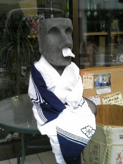 日本の夏・・・・うちの大将が・・おふるの浴衣を着せてくれました。しかし・・なんとなく・・・おかまちゃんにみえてしまう・・少し・・しなをつけた私モアイです。