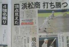 なんだか・・・周りがざわついてきた。今日・・決勝進出をかけての大事な一戦。浜松の地元のブログを覗くと「浜商・浜商」というブログタイトルが目立つ。うちの商店街の人も・・「今日は応援に行く」と言っていた。うちの親父も・・「浜商が甲子園に行ったら、トシヤと秋葉を甲子園に連れて行く」と約束をしていた。うちの親父も浜松商業出身である。昨日は・・ツレからメールが届いた。「甲子園・・・あるかもな!」銀行支店長もやってきて・・・「久米さん、浜商・・・甲子園あるかもしれませんね」とわざわざ言いに来た。なんだが・・・浜商関係者がざわめきだした。今日の相手は・・全国優勝したこともある常葉菊川。これに勝てば決勝進出、そして8年ブリ10度目の甲子園となる。なんと・・・・ここの監督は・・おいらのひとつ上の浜商野球部OB。高校時代・・よく「久米~、久米~」と応援団の私に声をかけてくれた。私が高校2年のときに・・・この先輩たちが浜商を甲子園に連れて行ってくれた。本日の新聞も因縁の戦い・・・などと見出しがついていた。今・・浜松が熱くなってきたよ・・・