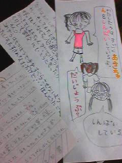 娘が・・・近所のオンナノコ達と小学校へ。そしたら・・学校の医務の先生より電話。なんでも・・連続逆上がりをしていて・・手がすべって・・鉄棒から落ちたらしい。そしてアタマから軽く出血したらしい。保健の先生が言うには・・血はかすり傷程度。ただ・・頭から落ちたらしいから吐き気とかしたら病院へ連れて行って、とのこと。幸いにも・・一緒に遊んでいた近所の女の子達が保健室の先生を呼んでくれたりして、大事にはいたらなかった。そのお友達と別れて・・自宅療養?しているアキハのもとに・・一緒に遊んでいたお友達から・・・こんなお見舞いの手紙が届いた。ありがたいことである。さっきまでぐずぐずしていたアキハは・・お母さんからのメールによると・・眠ったらしい。まあ・・たいした怪我ではないだろう。それよりも驚いたこと・・・何回も連続逆上がりをぐるんぐるんとしたそうだ。そっちの方に驚いた・・・だいたい・・・私、逆上がり出来ませんから・・・