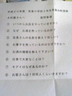 娘の通う気賀小学校2年生の生徒達が・・・明日19日の金曜日、「街中探検」ということで、地元の商店街やミニスーパー、コンビニなどを見学に行くようだ。商店街の一角にある当店にも白羽の矢があたった。昨日、娘の担任の先生より小学2年生が自分たちで考えたと思われる質問状が届いた。さて・・・いくつかの質問をいただいたのだが・・少しこの質問に答えてみよう。2、 なぜ お酒を売っているのか? A:お酒が大好きだから・・・4、 お菓子を売っているのはらなぜですか? A:君達のような小学生がお買い物に来てくれるから・・7、 モアイはなぜあるのか? A:んんんんんん~~~~んんん~~~~~なんて答えようかな~~~突然・・京都からやってきた・・・と言ったら信じるかなぁ。さて・・明日・・・小学2年生に・・・・どうやって答えよう・・・・モアイのこと。ちなみに・・うちの娘は・・・同じ商店街の中の・・お菓子屋さんに行くそうです。